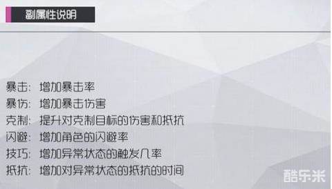 副属性为技巧、暴伤、暴击、抵抗、克制、闪避,副属性可以有三条,在模块到达5级、10级、15级时激活随机一项副属性