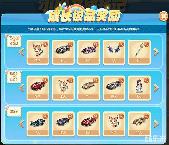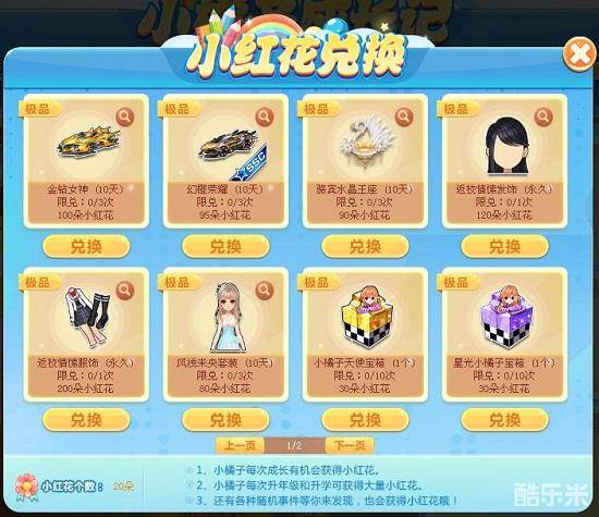 在成长、年级晋升和升学过程中都可以获得小红花,小红花可以兑换各种极品奖励和永久返校情愫套装。打开小橘子天使宝箱和星光小橘子宝箱必得100点券,有机会获得宠物-小橘子天使、星光小橘子。