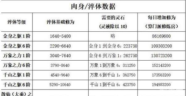 其实从表中可以看到,肉身到金身1之后,基本淬体是不可能回本的;地仙1-2升肉身需要700亿修为,真诀党基本要40-50天才能升完。