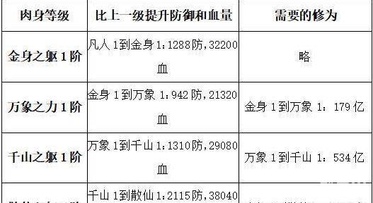 下面表格会列出各级肉身所需要的修为、淬体灵液灵石和效果。