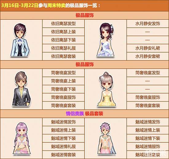 3月16日-22日期间,极品套装【雪鸢白羽套装】、【暗夜黑羽套装】、紫钻专属【银姬芸妍套装/咖羽凌樱套装】、【简奢晚宴套装】等限时出售!早春时节,众多美衣让你媲美春光!
