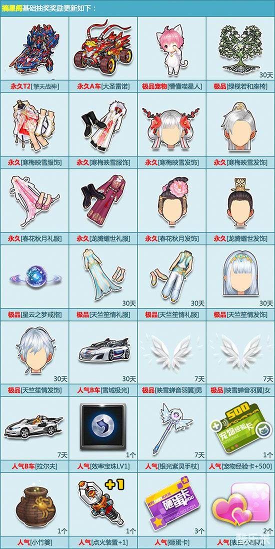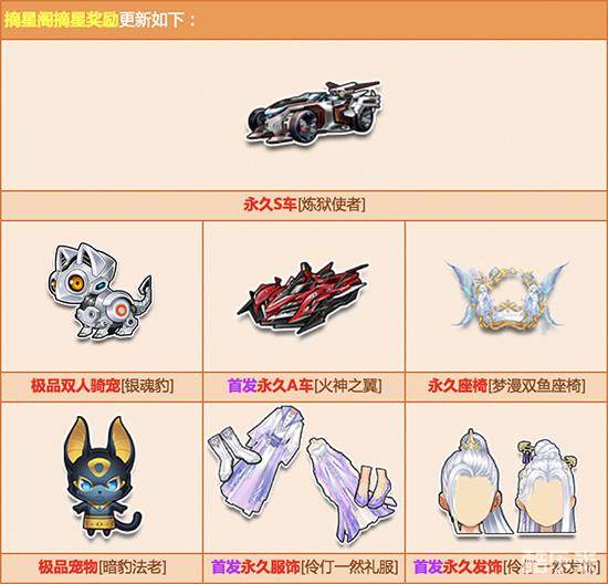 3月9日-4月7日起,【摘星阁】极品奖励更新,在【摘星阁】中参与抽奖,每进度积满可100%获得:永久S【炼狱使者】、永久双人骑宠【银魂豹】、永久首发A车【火神之翼】等之一,已获得奖励不会重复获得!千万不要错过!