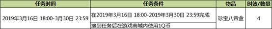 2019年3月16日 18:00-3月30日 23:59,在游戏商城内使用1Q币即可领取4个珍宝八音盒!