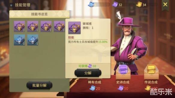 在游戏里,攻城战也算是非常常见的战争了,对于敌人的厚实**,许多玩家会感到非常头疼,往往还没到达主城堡的位置,就已经全军覆没,所以对于攻城战,推荐玩家学习侍从技能——破城者,破城者技能能给我方所有士兵的攻城值提升百分比的加成,越高级的正义祷告技能加成越高,有了它,轻易攻破城门也就不是梦了。