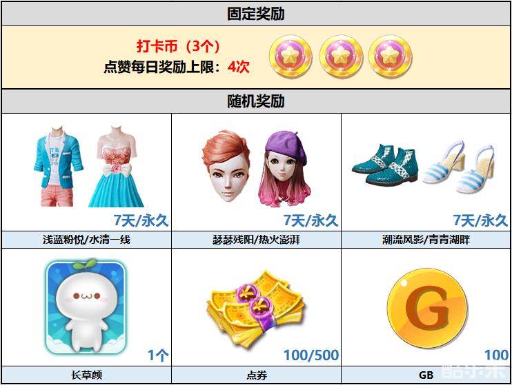 每日最多可获得4次点赞奖励,每次点赞必得3个打卡币,此外还会获得以下随机奖励之一,永久人气套装、发型、鞋子等你来拿!