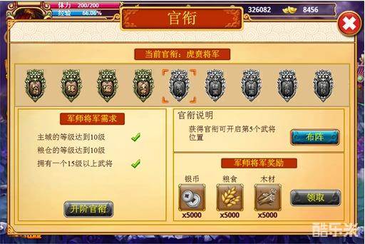 比如要想达到虎贲将军的官衔,需要主城等级达到10级,粮仓等级达到10级,拥有一个15级以上的武将。这样玩家只要达到要求,就可以升到虎贲军衔,同时开启一个新的武将位。