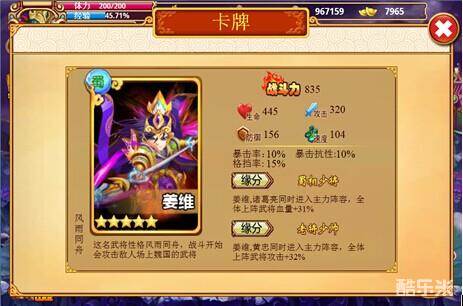 游戏中还有缘分系统,缘分内的所有武将都进入主力阵容,可以开启某个缘分,缘分开启后会有属性加成,这里要注意是,只有进入主力阵容再能开启缘分,替补整容是不能开启缘分的,但是开启的缘分后,所有己方参战武将都可以享受缘分带来的属性加成,无论是替补还是主力武将,同时当开启缘分的主力武将死掉后,这场战斗的的缘分加成还会存在,直到这场战斗结束。
