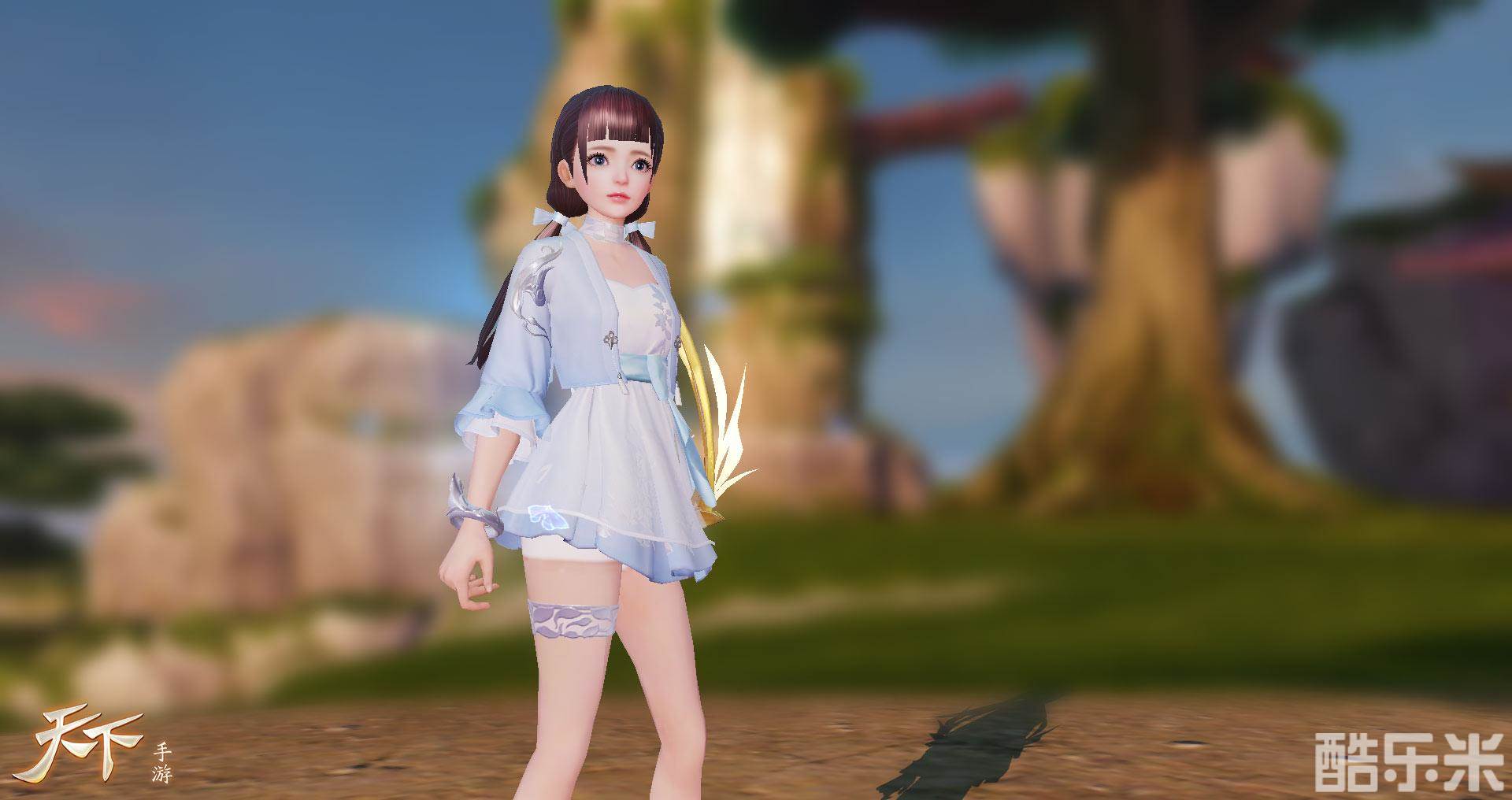 同时,提起少女系的小裙子,那就一定要提起时装“露萤清夜”的大名。清淡的冰蓝色系在《天下》手游的众多时装中独树一帜,上身清爽的对襟短袄搭配白纱连衣短裙更是瞬间将少女娇美的形象勾画了出来,是初恋般心动的感觉没错了!