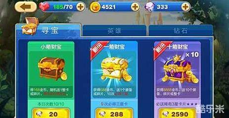 一箱财宝,必得688金币,随机获得一张装备或者碎片,10次则必得三星卡,每次寻宝需要花费288钻石。