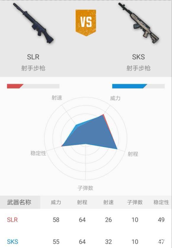 SKS是游戏中元老级别的“射手步枪”,是许多老玩家和职业选手的宠儿,拥有五个配件卡槽,同时游戏也推出该枪的“赤橙”皮肤。SLR则是伴随着游戏内容更新后继推出的枪械,具有较高的“颜值”,可以说是射手步枪家族内的“小鲜肉”。对比前辈SKS,SLR缺少握把类型的配件和枪械皮肤。