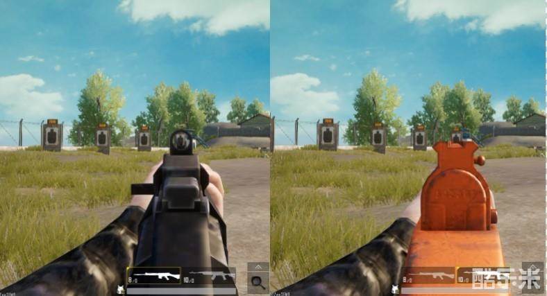 对比二者的裸枪条件上的开镜视野,我们会发现,SLR比SKS有着更加出色的机瞄视野,射击角度比较舒服。在降落初期,该枪完全可以不用装配基础瞄镜,就可以很舒服地机瞄射击,表现较为出色。这也算是SLR在游戏初期的一项枪械优势。在装配了瞄镜之后,二者的开镜视野就没有什么的差距了。