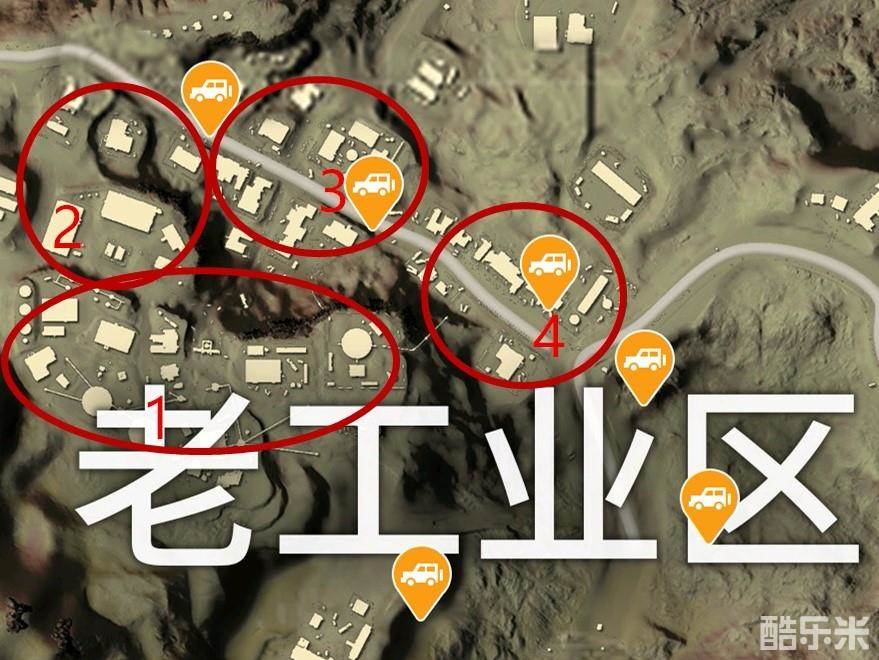 在老工业区,并不推荐跳1号区域,因为这里物资分布实在太过分散,空有良好的地理位置而没有强大的火力支持是不行的。建议跳3号区域远离山脉的位置,那里不仅物资丰富,而且还能避免被1、2号区域的敌人利用高度优势击倒。战术选择还十分多样,可以根据情况选择强攻山脉,或者入侵4号区域进一步发育都行。