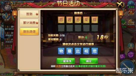 古人云:书中自有黄金屋,书中自有颜如玉。那么在高考之际,《紫青双剑》同样也要在游戏中下一下这方面的功夫。在活动期间玩家可以在“欢乐诗词”界面选择自己擅长的是“五言”还是“七言”,随后进入游戏界面,玩家根据提示来依次点击下方的文字组合成正确的诗词。玩家每答对一题都会获得绑定元宝、经验和积分的奖励,同时参加七言获得的积分会比五言的要多,同样难度也会增加,大家还是要谨慎选择。