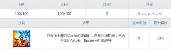 只有浅上藤乃(Archer)装备时,自身在场期间,己方全体的Arts卡、Buster卡性能提升