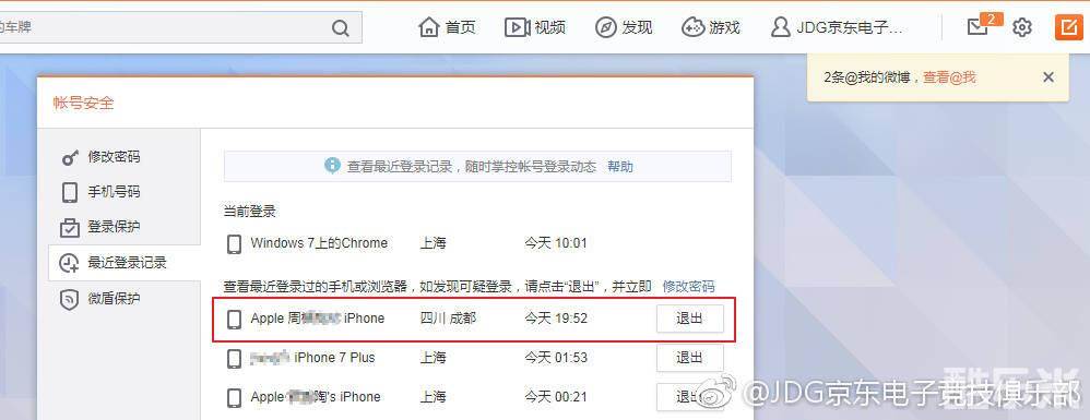 我们可以看到在19:52时,微博在四川成都异地登陆了!