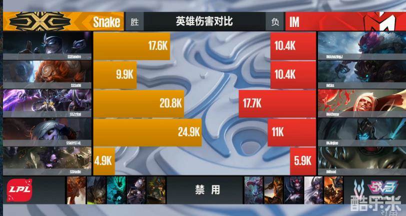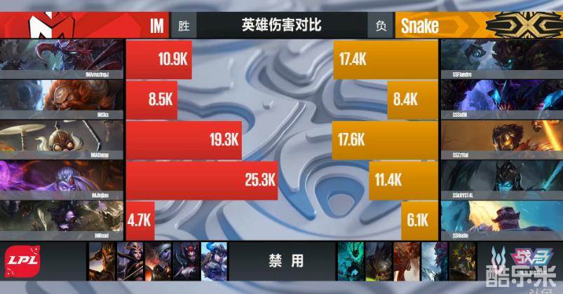 最终,随着IM搏命开团失败后,慎收获三杀,Snake从中路一波推进将IM基地拿下,首局先下一城,这也宣告着IM已无缘季后赛!