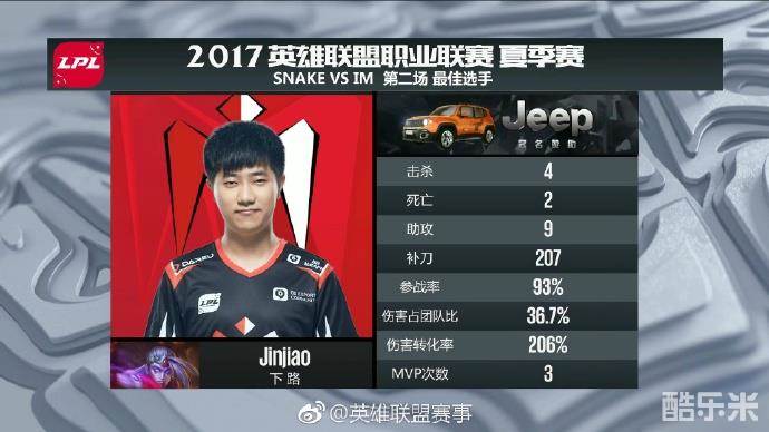 随后,IM转战下路,洛再度先手开团,Snake四人被杀后,IM成功一波结束了比赛,让一追二战胜Snake!