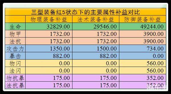 雷利突破后的三围成长属性总值为36.32,由于雷利本身是防御型装备,先天获取的属性补益就占据了很大优势。我们简单对比一下物理、法术和防御型装备在全红5星状态下的主要属性补益对比,如下图: