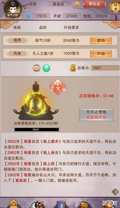 然后关于境界,氪金无所谓的,就是零氪的,在练气的时候3分钟卡点(这里最快是三年,我当时是刚四年升的筑基)