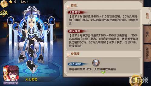 法师系神将SSR太上老君有着稀有级的召唤概率,但神将的技能与属性却是可圈可点。普通攻击与怒气攻击除了给敌人造成毁灭性的伤害,还将附加“封印”或“灼烧”或“冰冻”的状态让敌手措手不及。当神将处于觉醒状态,不仅抗暴以及伤害减免得到提升,对阐教神将的伤害也将随之提升。