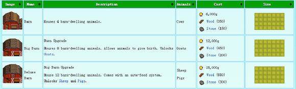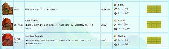 这分别是一级二级三级牛棚的售价,建造和升级大概需要两三天的时间。不考虑猪车的运气问题,这里将是你大牛奶和大羊奶的唯一出产地,羊毛不算,咱要兔毛(神tm羊和兔子掉一种毛)。我们可以看到,牛棚的售价并不贵,只是要的材料比较多。不过罗宾那木头10g一个,石头20g一个也不算贵。如果不走畜牧流,一个牛棚完全足够。