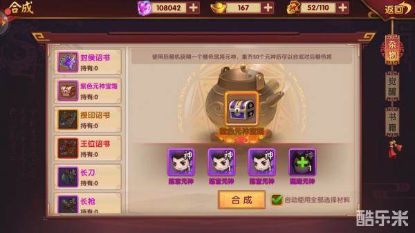 这就是你需要用到合成系统了,这边为你提供了三大板块儿,首先第一板块儿就是杂物----这一块儿可以合出你武器,紫色元神,橙色元神,封侯诏书,授印诏书,王位诏书,觉醒石,这样一来各位大大们就可以更加快捷的拿到自己想要的物品了。觉醒-----这里是用来合成武器之魂的哦,书籍-----通过合成可以的得到适合武将的修行书籍