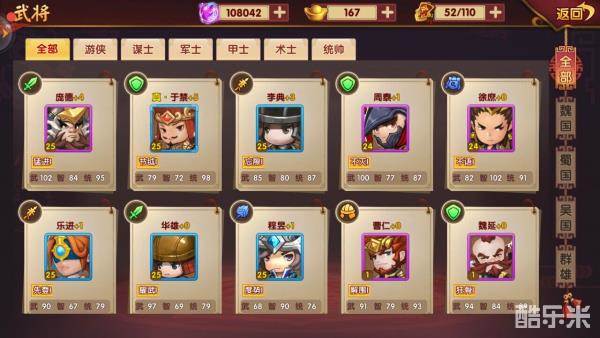 点开武将系统之后会有一个全体显示,然后下面就是魏蜀吴三国武将的各个合集,群雄---就是展示出不属于三国的一些武将,这样系统帮你一分看起来就好多了呢