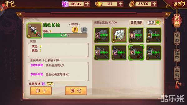 点开装备系统之后右手边依次显示出武器,头盔,铠甲,战靴。这就是一套上阵装备了,这面还可以展示出是哪位武将穿戴了哪一件装备,还可以为你整理出套装排序和套装等级排序使用起来非常方便呢