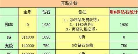 开路先锋在这次活动中,钻石升级费用8折,所以没有任何优惠和使用R券的前提下,开路先锋升级到RS80级需要金币594000和5490钻石,但是使用R券之后,只需2730钻石,R券为我们节省了2760钻石!