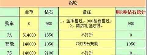 涡轮升级不打折,还是按照老R车的风格,7次充能!所以,没有任何优惠和使用R券的前提下,涡轮升级大RS80级需要金币594000和5480钻石,但是使用R券之后,只需2030钻石,R券为我们节省了3450钻石!