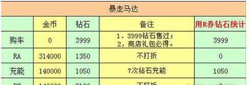 由于末日的黑马史,使得暴走马达身价不会低,rmb出售,钻石出售3999!所以,没有任何优惠和使用R券的前提下,涡轮升级大RS80级需要金币594000和8499钻石,但是使用R券之后,只需5049钻石,R券为我们节省了3450钻石(注,由于暴走马达很早就是升级RS了,所以充能忘了是5次还是7次了)!
