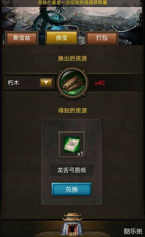 本次正统三国过关斩将版本里,将新增绿材料兑换功能。个人等级≥110级的玩家可开启绿材料兑换功能,主公们可将绿材料通过一定的数量比例兑换成龙舌弓图纸。