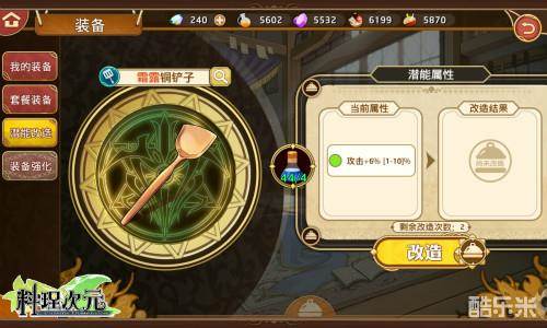 主厨可以消耗装备改造材料,来改变装备潜能属性的类型和数值,而且,还可以选择是否替换原来的属性。通过选择基础属性、潜能属性的某一条属性进行强化,强化等级共分为10级。而强化这些属性,需要消耗狗粮装备、装备强化材料或特级强化材料,且每件装备都有一个初始改造次数,当改造次数用完后就不可以再改造了。若主厨还不满意,可以使用再铸石将装备的改造次数再次充满来进行改造。