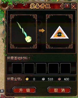 将需要升级的装备拖动到界面左边的装备框体中,同时自动在右边显示升级后的装备;升级过程中,装备自身携带的强化能力将保留到升级后的装备,包括装备品质、天生随机属性、加工级别、孔数、已经镶嵌的卡片属性、已经激活的隐藏属性、附魂属性;