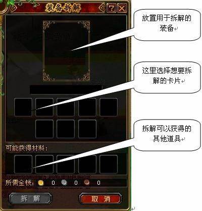 以修改所需要获得的卡片;点击拆解按钮,拆解后获得的材料显示在下面的框体中,被拆解装备消失,将玩家获得的卡片