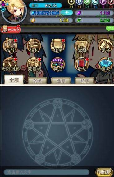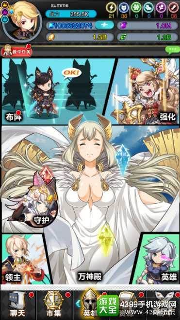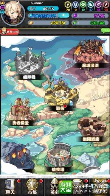 游戏共有5个主页面可以左右滑动或点击切换,分别是聊天、市集、英雄、资源和战斗。