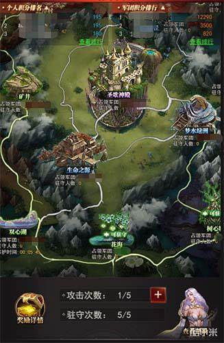 点击王者军团战,我们就可以看到辽阔的魔幻大陆全貌!每个军团都可以驻扎自己的军队进入某个领地,享有他的控制权!外围地图为双心湖、花海、树心城、听风港、龙穴、风车镇、北岸村与矿井共八个,而中间地带则是生命之源、龙脊高丘与梦水绿洲,正中央便是重中之重的圣歌神殿了。