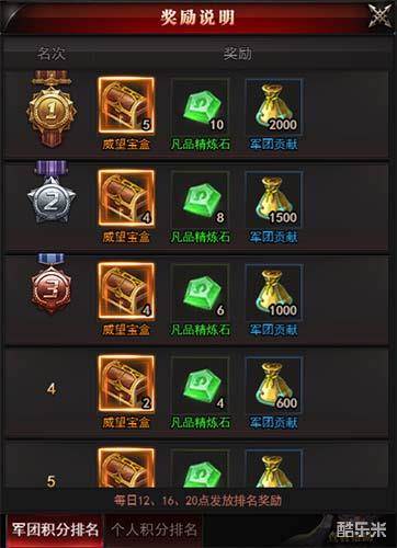 当然了,王者军团战能这么受欢迎,与他的奖励不无关系。每日会对玩家与军团的所得积分进行排名,并在当天的固定时间发放奖励,积分排名高的军团内所有成员都可以获得军团奖励,而个人积分奖励则由该玩家独自享有。战斗不光是为了军团,更是为了自己!