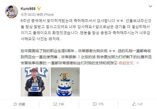 BLG的中单选手Kuro迎来了自己出道六周年的纪念日,在自己的微博上他感谢了粉丝一直以来的支持,并且承诺他们会打好接下来的比赛,晋级季后赛。