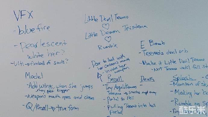 这是蓝天会议的白板。上面的内容有可能最终一项都无法入选 – 毕竟只是早期的头脑风暴!接下来我们会测试一些我们喜欢,但不确定游戏内效果的想法。有时候会有特别棒的2D概念图,但在游戏内表现却不行的情况。作为产品经理,我会对最终的皮肤负责,所以这意味着决定最终加入哪些功能是我工作的一部分(以及砍掉哪些功能)。我通过团队、美术和制作负责人、交付负责人、工程团队、市场以及任何合伙团队(比如全球总决赛冠军皮肤中的冠军战队)的直接反馈协助我做出决定。我们通常从蓝天会议开始探索点子。