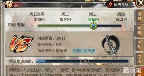 战前准备在周三全天开启,玩家可以组队进入指定副本收集资源,资源的数量决定了战斗中本帮守卫的强度。