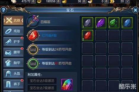 每三个同等级同品质的宝石可以合成一个更高等级的宝石,每件装备都有3个宝石孔,第一个孔金币即可打开,后面的2个则在满足等级要求之后,还需要元宝才能完成。