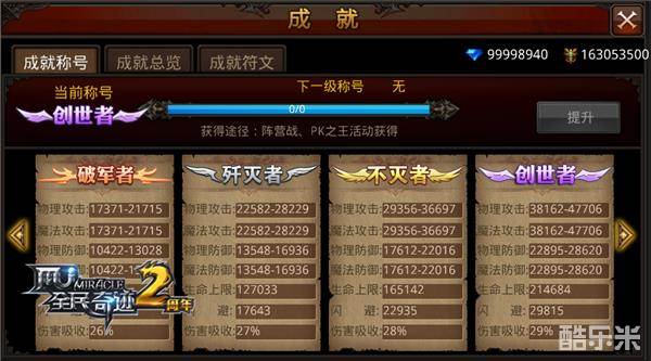 守护者、先锋者、无畏者……相比于声望军衔的主攻属性加成,现目前共计十二阶的成就称号,则是为玩家们带来主防属性加成。在《全民奇迹MU》5.0新版本上线之后,成就称号同样也会获得四个全新的提升等级:破军者、歼灭者、不灭者、创始者;换言之,玩家们在5.0大时代中,将拥有更强大的生存续航能力,以应对奇迹大陆更深处的全新挑战,去探索上古时代的更多秘辛。