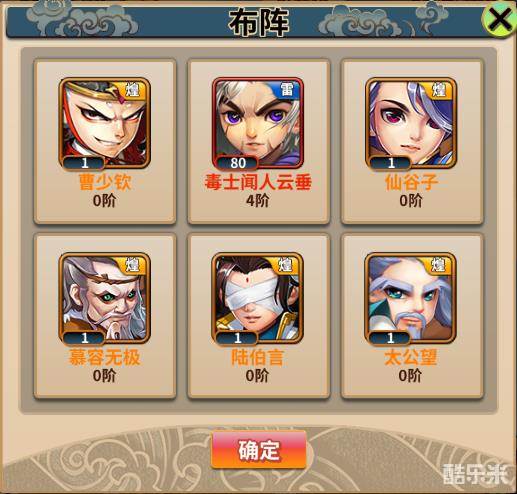 站位可以考虑1-6号位(从左到右从前到后):曹少卿、主角、仙谷子、慕容无极、陆伯言、太公望