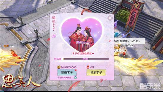 进入游戏,诗友有没有发现在众多“系统”按钮中,多了一个“宝宝”?不过,在遇到宝宝之前,还要经过“拼脸”的一道难关才行。诗友可以通过“普通求子”和“良辰求子”两种方法来进行姻缘求子。求子并非一蹴而就这么简单,在最初很可能会失败,但是与此同时,是有的幸运值也会增加。随着幸运值的增加,求子成功的概率也会随之升高!如果想加快求子“效率”,诗友不妨到元宝商店中购买“姻缘符”进行良辰求子哟~温馨提示:即便诗友“单身”,也可以进行姻缘求子!