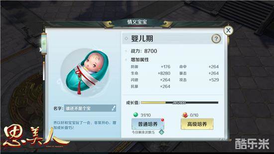 当诗友求子成功,就可以开启“养成”之路啦!宝宝会经历婴儿、幼儿两个阶段,在这期间,需要诗友通过“育儿丹”哺育他长大。这个重要道具,参与“宝宝大营救”即可获得。当婴儿期、幼儿期的成长值都满了,宝宝便算是“长大成人”了。即便“长成”,诗友继续对宝宝“投食”,也是可以让宝宝的多重属性稳步增长的,带着各种属性全面发展的“强力”宝宝,即便行走在危险乱世,也会十分安心吧?
