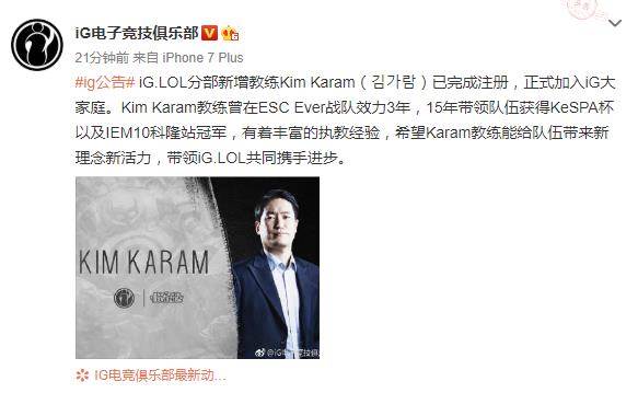 今天,IG官博发布公告,LOL分布新增教练Kim Karam,原文如下:
