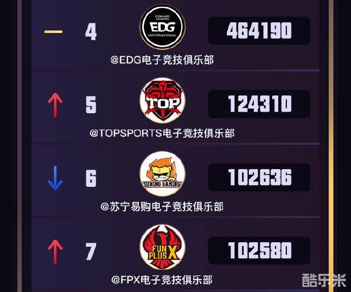 紧随其后的是EDG战队、TOP战队、SN战队以及FPX战队。EDG战队在赢下昨天对阵BLG的比赛后,晋级形势一片大好。TOP和FPX战队本赛季成绩十分出色,也因此吸引了不少的粉丝,TOP战队势力上升至第五,FPX升至第七。SN战队由于拥有众多明星选手,因此战队势力也排名较靠前,但他们本赛季已经无缘季后赛了。