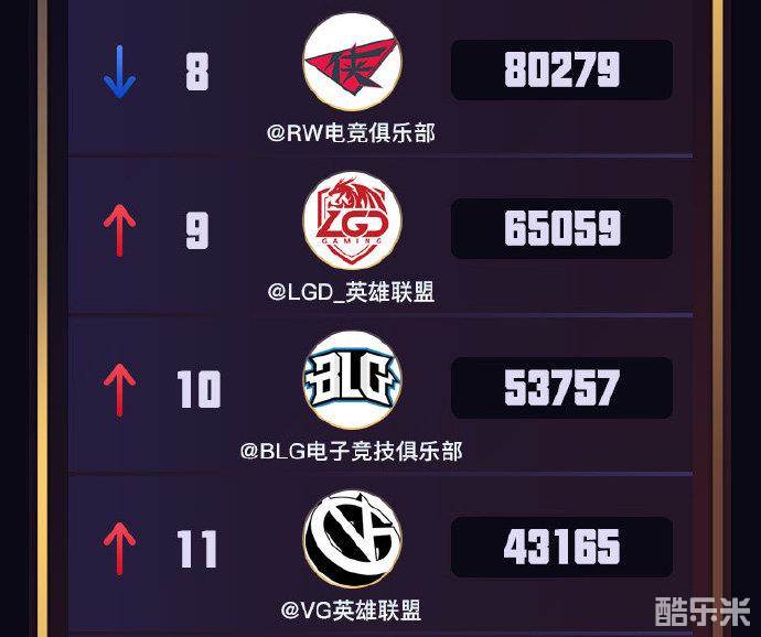 RW、LGD、BLG、VG四支战队中仅有BLG战队存在晋级希望,但由于队员大部分是名不见经传的新选手,因此战队势力排名靠后。
