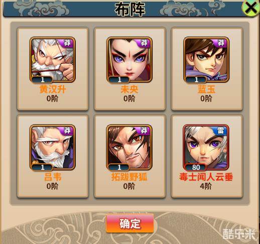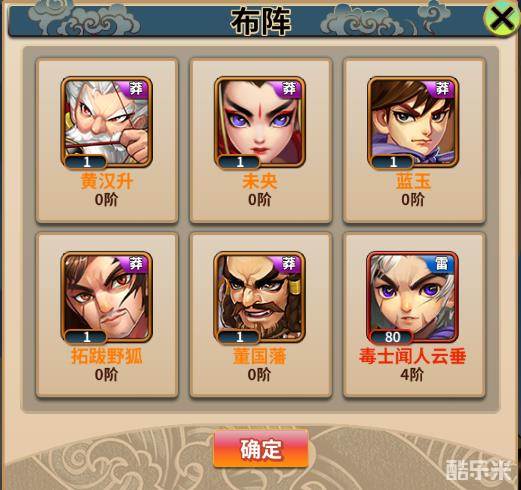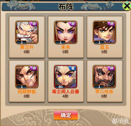 站位可以考虑1-6号位(从左到右从前到后):黄汉升、未央、蓝玉、拓跋野狐、董国藩、主角